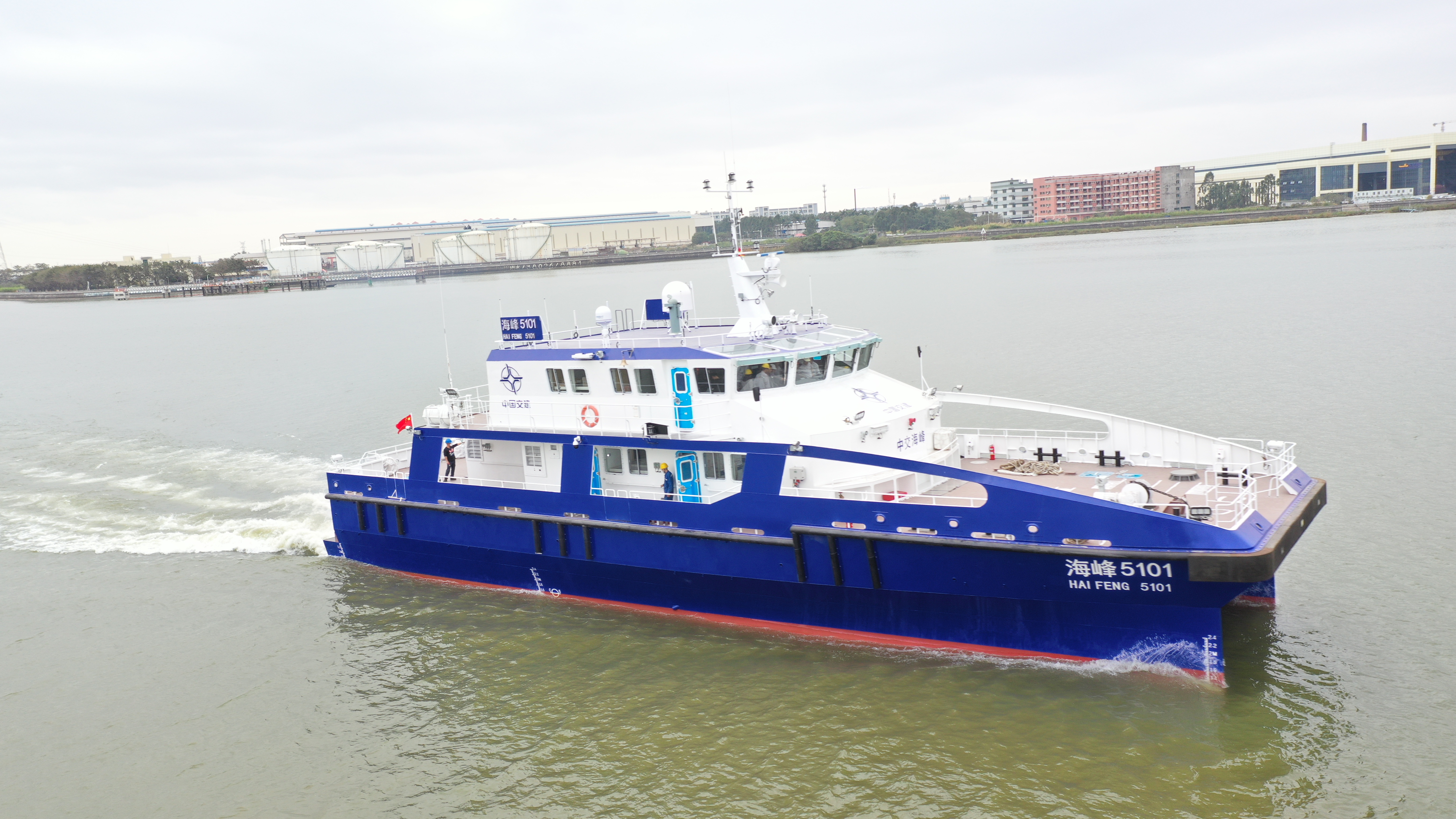 “海峰5101”风电运维船是2007so太阳集团打造的最新一代海上风电运维船舶(CTV),该船入级CCS船级社,全铝双体半小水线面结构设计,总长33.2米,型宽10.8米,型深4.4米,试航航速约27节,续航能力达到500海里,额定载客12人,快速性好、耐波性强,是目前国内首制半小水线面型全铝双体风电运维船型。