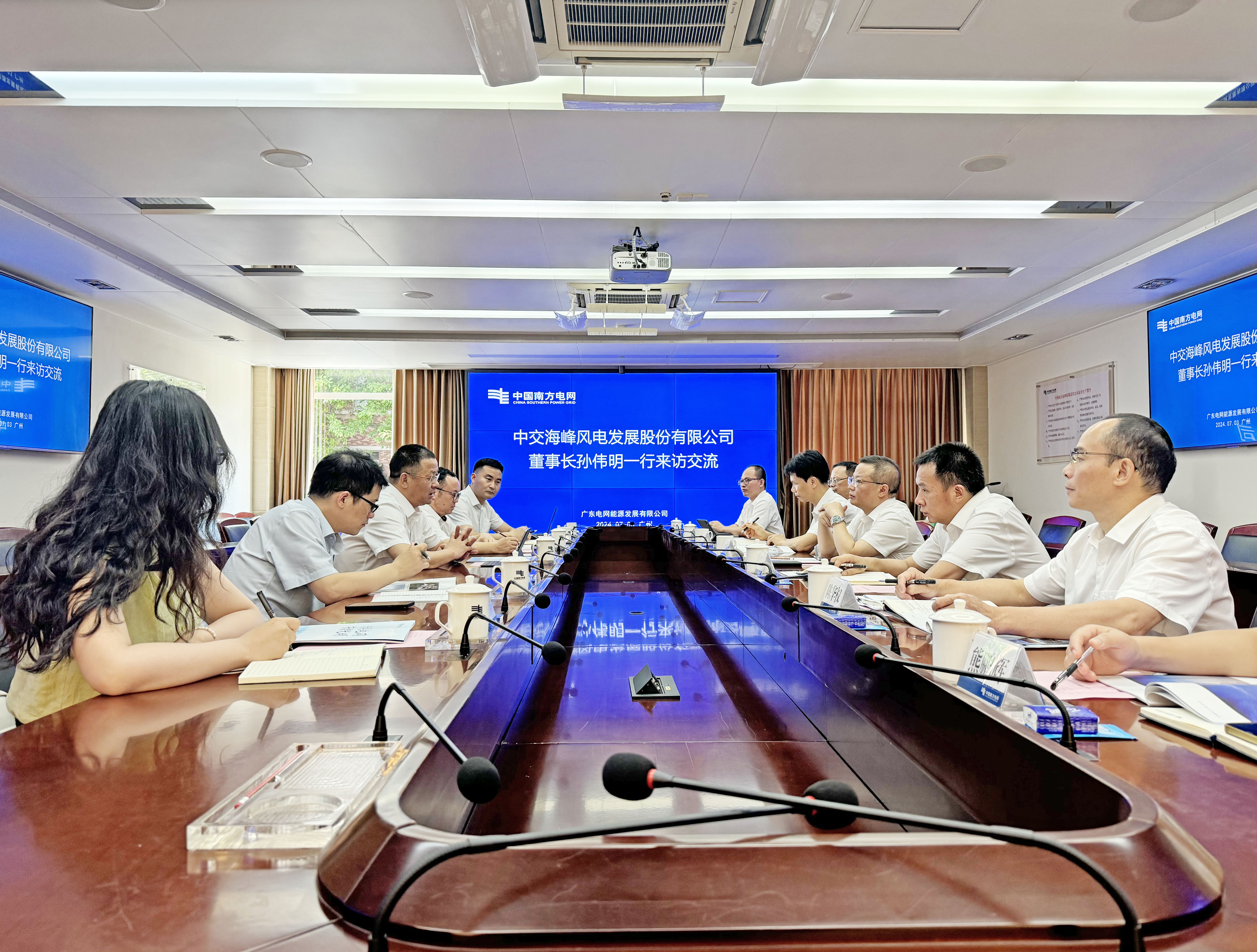 7月3日,2007so太阳集团党委副书记、董事长孙伟明在广州市拜访中国南方电网广东电网能源发展有限公司总经理王晓明,双方就海上新能源业务合作进行了深入的沟通和交流。