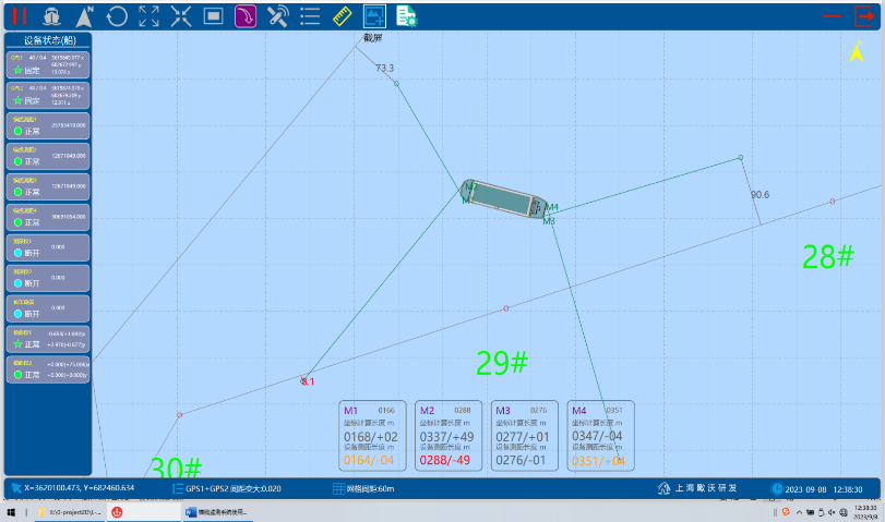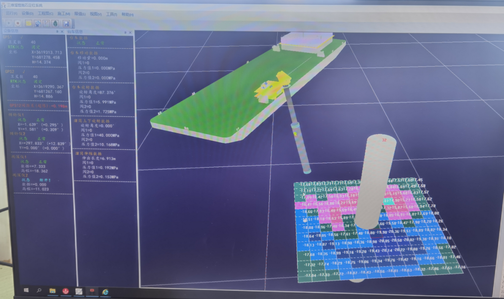 (2)智慧化三维定位技术公司研发了一套溜筒测控系统,可三维实时显示导管与基础之间的相对位置,超过安全距离可实时报警提示,利用工控机PLC可实现远程施工控制。在溜筒的头部安装了传感器,能够实时监测抛填标高。