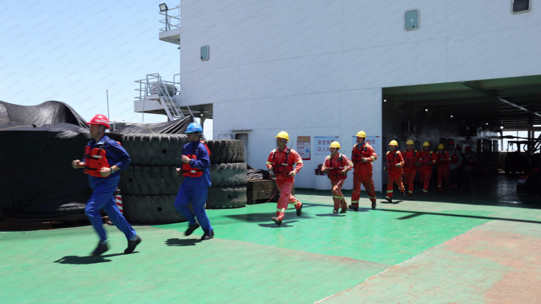 演练规模大科目全,贴近实战强能力。演练总投入船舶6艘,包括起重船、交通船、应急保障船,并以“海峰5201”船舶作为指挥中枢。主场地设在“联合海工1500”起重船,共设置六大实战科目:防台防汛启动部署会、船舶甲板部件加固与设备绑扎、船舶水密舱门关闭检查、人员紧急转移撤离、模拟人员落水快速救援以及人员受伤应急包扎与送医救治。演练模拟台风逼近场景,指令清晰,响应迅捷。