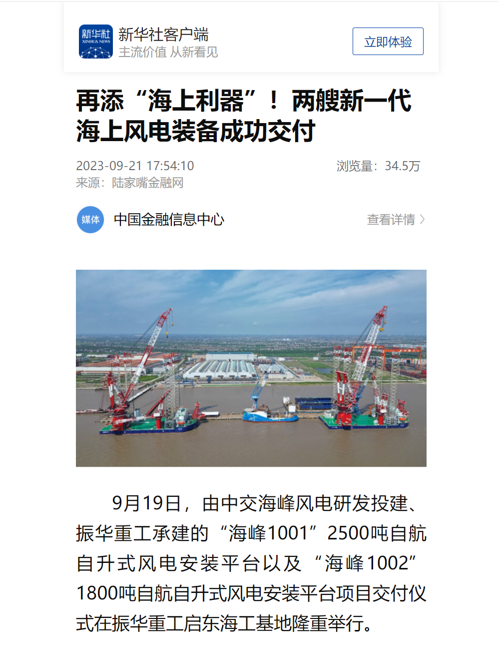 9月19日,公司研发投资的“海峰1001”2500吨自航自升式风电安装平台与“海峰1002”1800吨自航自升式风电安装平台交付仪式与信息发布会圆满举行。有关政府机构、行业协会、企业共20余家单位出席活动。