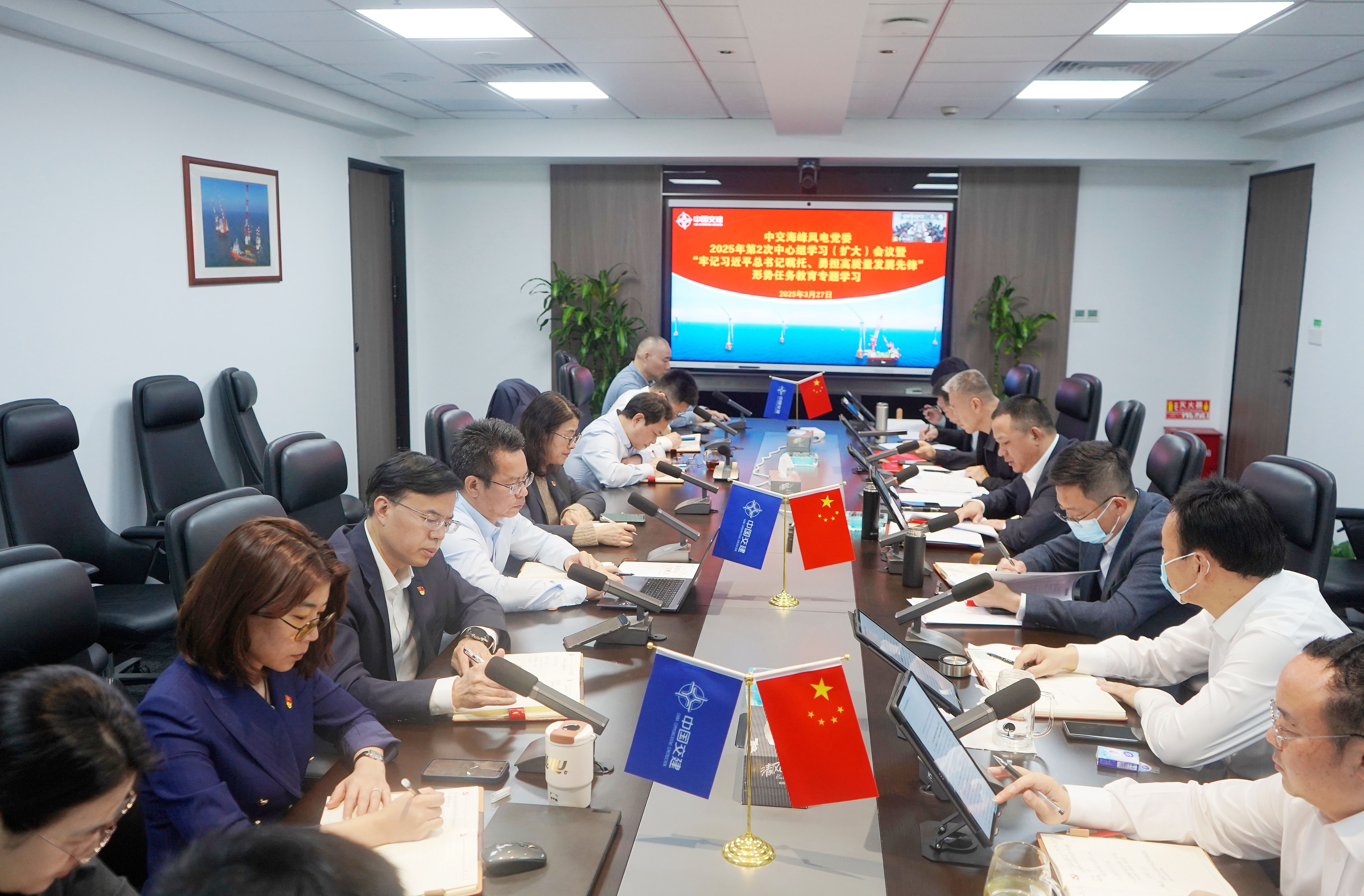一是深入领会两会精神,坚定发展信心。全国两会为国家发展明确了目标任务,也为我们企业发展指明了方向。公司各级党组织要坚持以习近平新时代中国特色社会主义思想为指导,全面贯彻落实党的二十大和二十届二中、三中全会精神,紧紧围绕两会部署要求,坚持稳中求进的工作总基调。要深刻理解两会传递出的政策信号,尤其是与风电行业相关的内容。在实际工作中,积极响应国家政策,加大在海上风电运维、技术研发等方面的投入,以更加坚定的信心和决心,真抓实干,确保完成公司全年各项改革发展任务目标,为实现“十五五”良好开局贡献力量。同时,借鉴中交集团在践行国家战略方面的经验。要积极投身国家新能源发展战略,注重项目质量和环保要求,打造绿色、可持续的海上风电工程,为国家能源结构转型贡献力量,在国家战略的大棋局中找准自身定位,实现公司的长远发展。